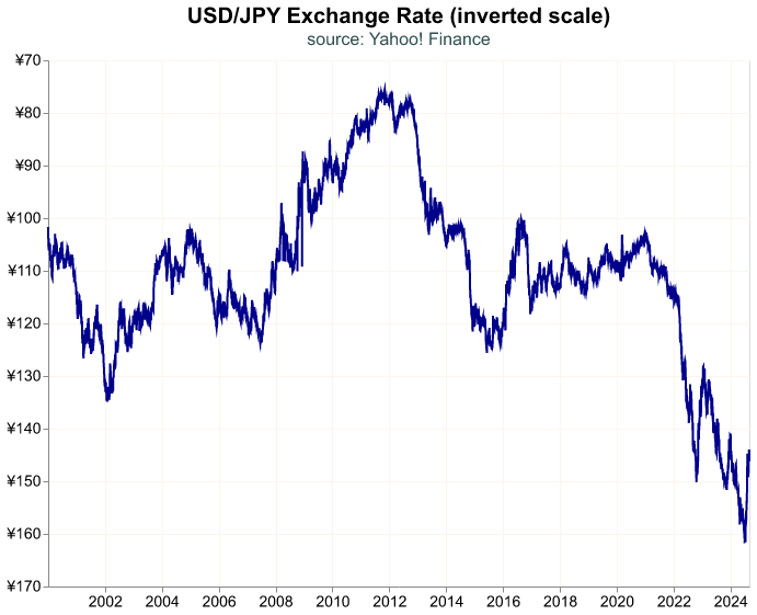 'USD/JPY Exchange Rate (inverted scale)',