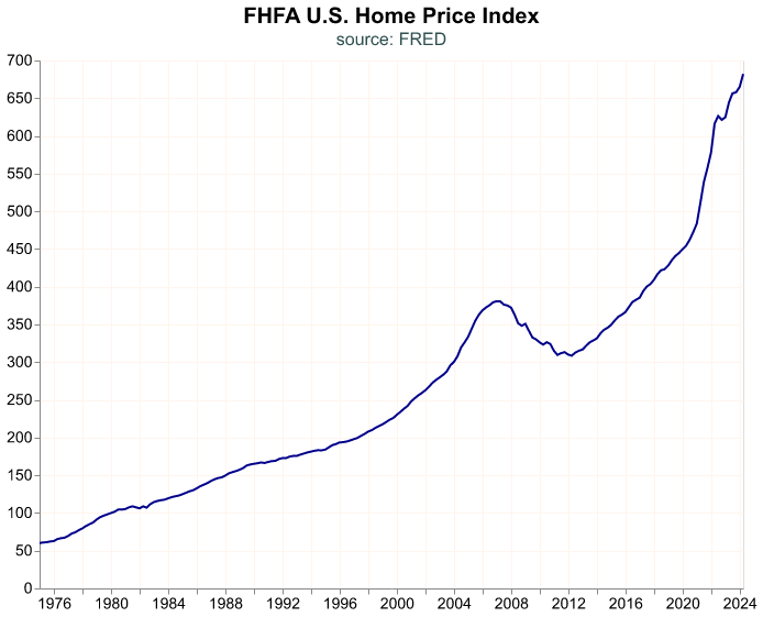 As an initial step let’s pull the FHFA home price index for the whole country and visualize how prices have behaved over time. We pull this index from FRED and get its whole history starting in 1975.