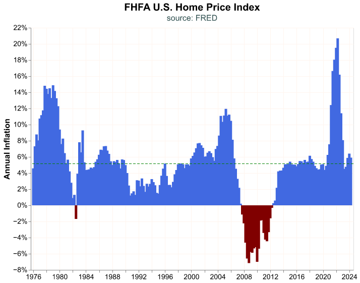 house_pr['annual_inflation'] = house_pr['Price_Index'].pct_change(4)Let’s visualize annual home price inflation and use a similar template to one we used for GDP. We will make a bar chart with different colors for positive and negative inflation. In addition, we will add a dashed line at the average annual inflation over the whole period; this is an easy trick to include more information in a chart with minimal work.