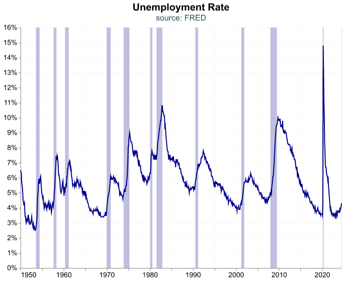 We chart the unemployment rate below along with our recession shading. Other than around the Covid shutdowns, the unemployment rate has been quite low from the Great Financial Crisis through 2023. In fact, we need to go back to the 1960’s to find another era with unemployment hovering around 3.5%.