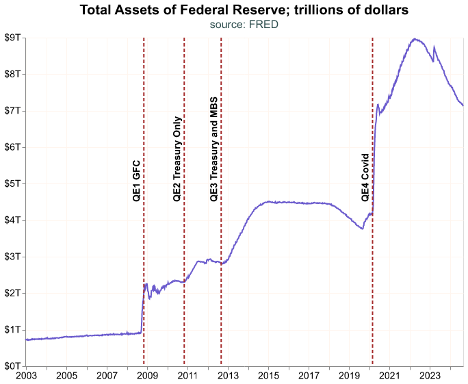 Let’s visualize the growth in Fed total assets and add vertical lines that mark the start of each round of quantitative easing (QE), just as we did in Interest Rates. We will scale assets to trillions of dollars, but notice we do it differently than before; instead of reassigning the column in the dataframe, we change the labels in the y-axis by dividing the original value by one million (this is the labelExpr argument in the chart). This is just an alternative way to achieve the same outcome (namely, plot trillion of dollars) but with an important difference: the plot is in trillions while the dataframe remains in millions. Any change we make in the labelExpr only affects the chart and leaves the dataframe unaltered.