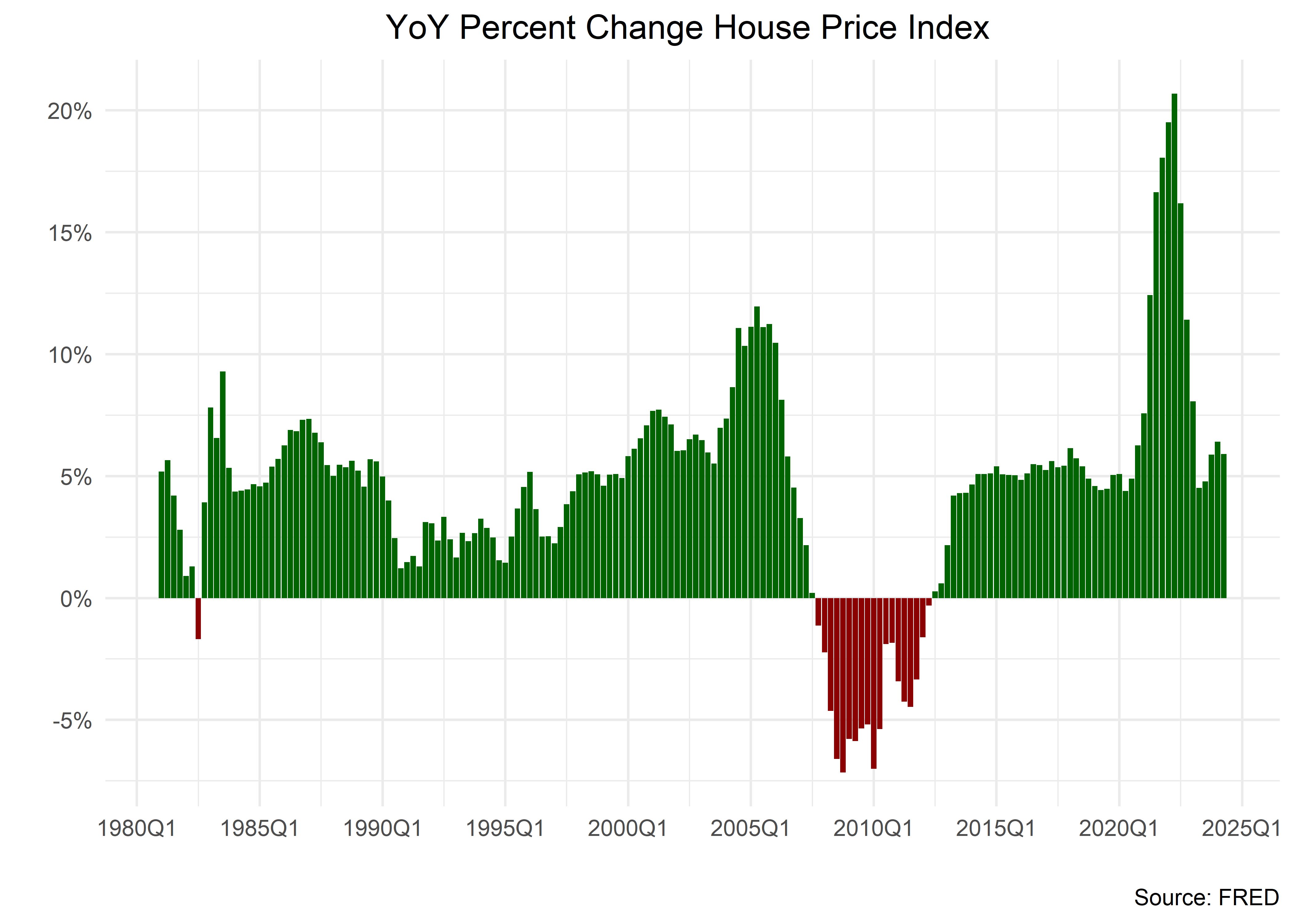 mutate(yoy_change = price / lag(price, 4) - 1)Let’s visualize annual home price inflation and use a similar template to one we used for GDP. We will make a bar chart with different colors for positive and negative inflation.