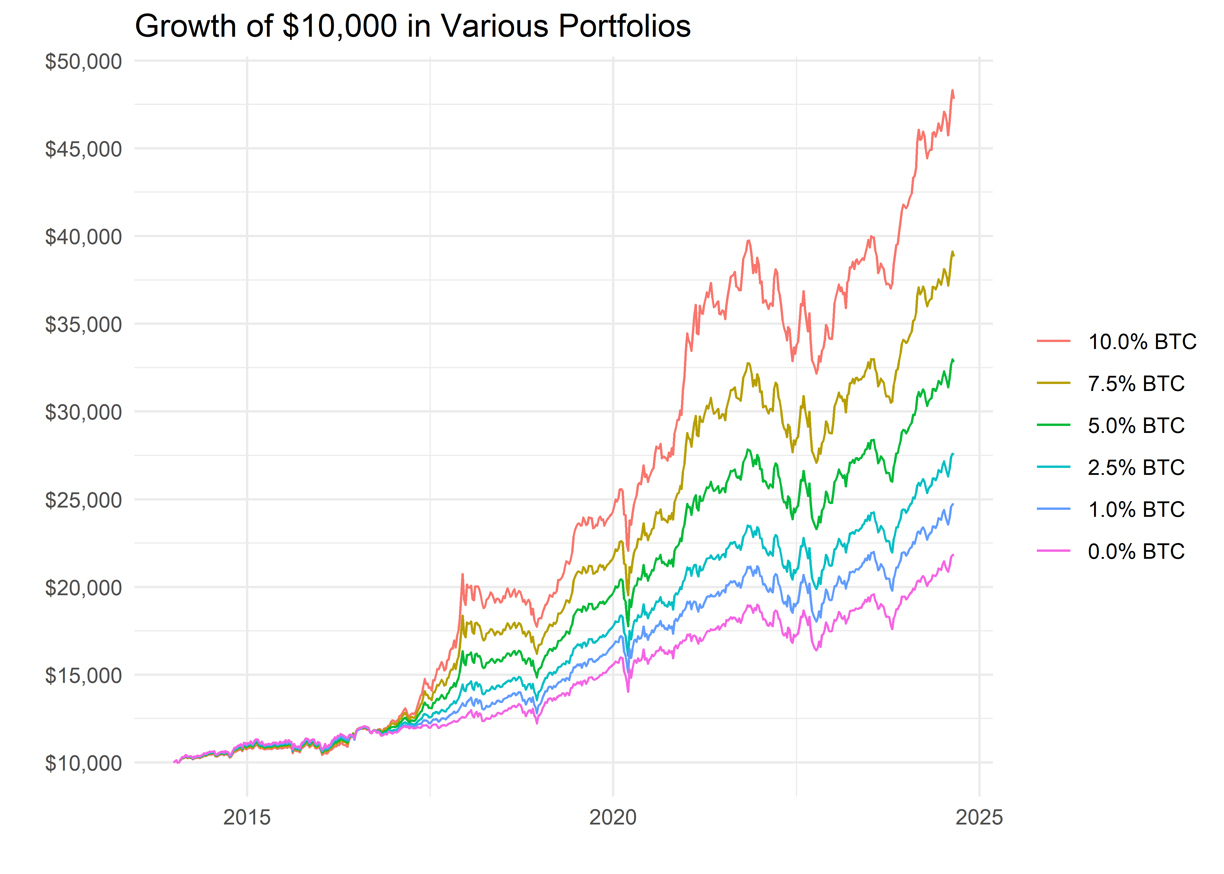 2) create a table of various weights, ranging from 0% to 10% allocation to BTC