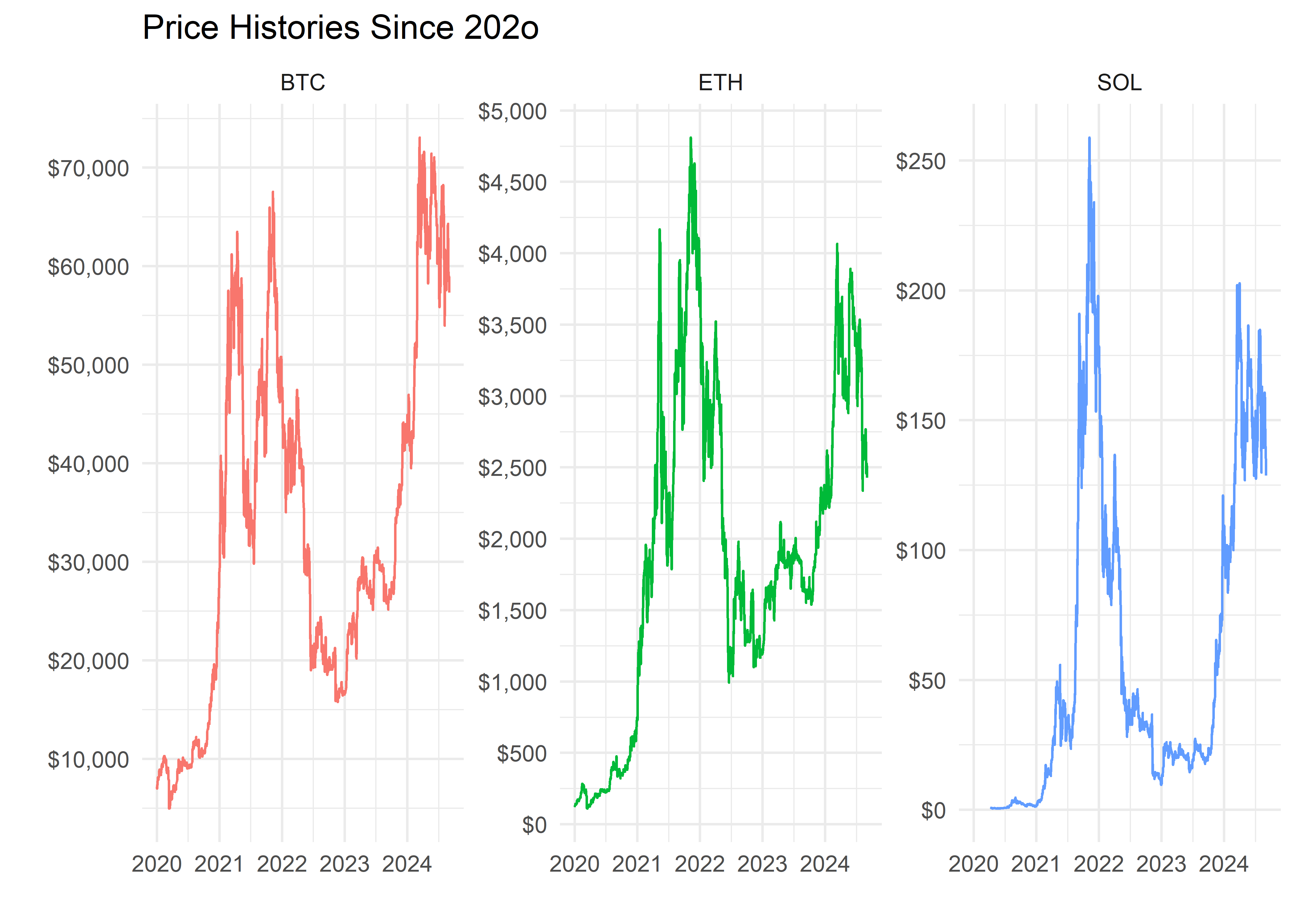 Our ultimate goal is to incorporate these coins into our model portfolios, and that means we would like to investigate the coins’ effect on our portfolio histories. Since we want to reach back in time several years, we will exclude the coins for which we have only one or two years of data. That leaves us with the following set of prices histories: