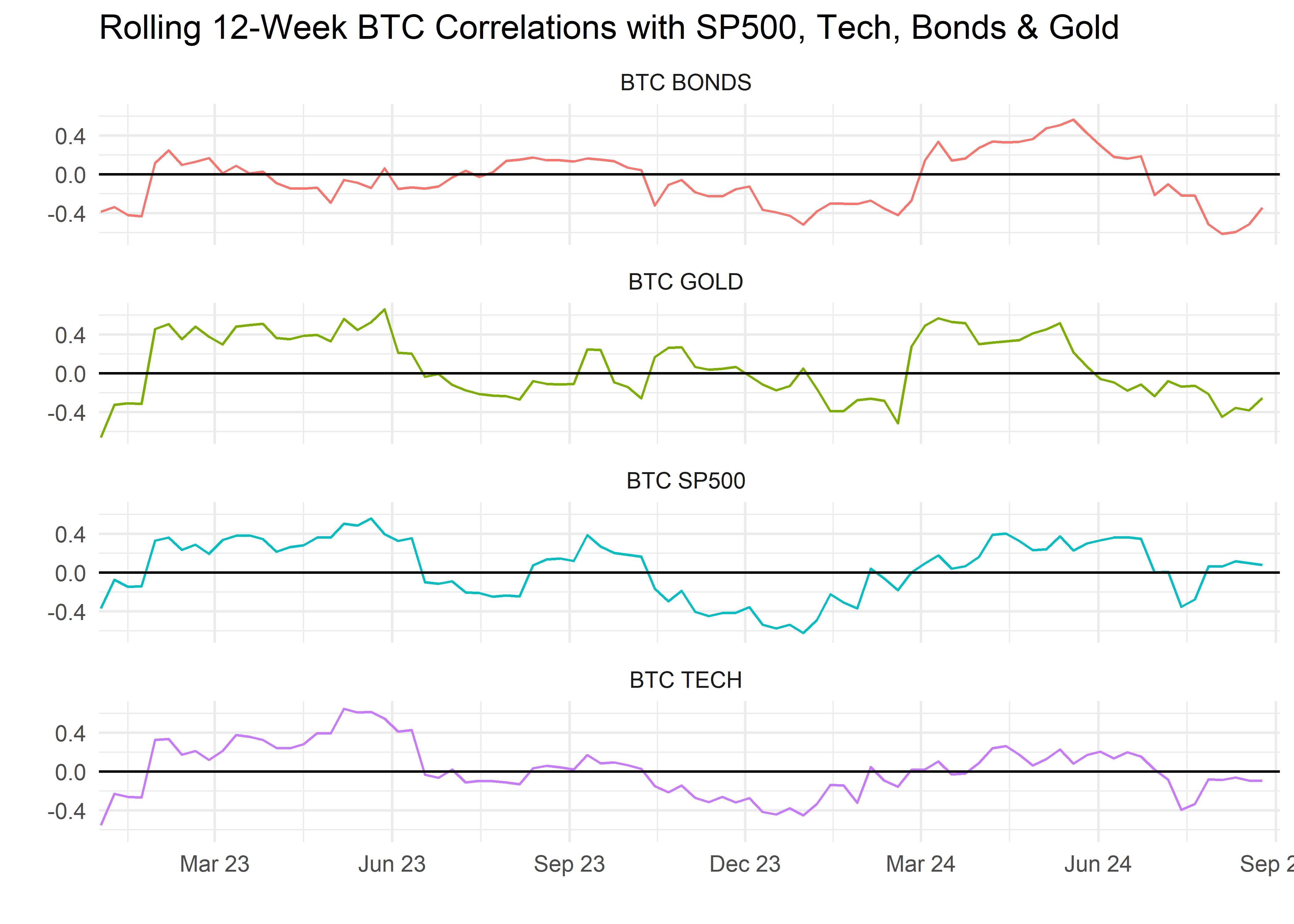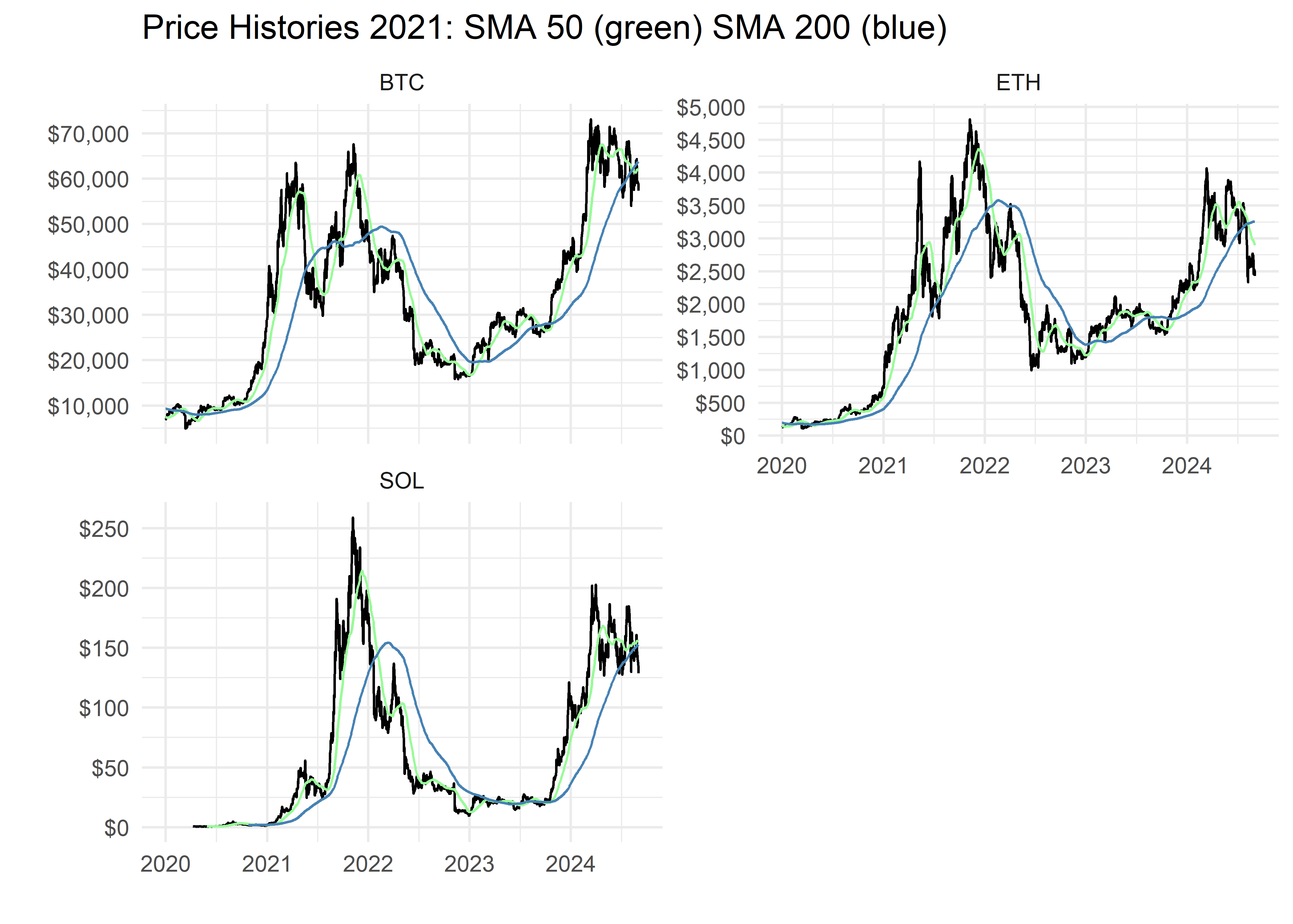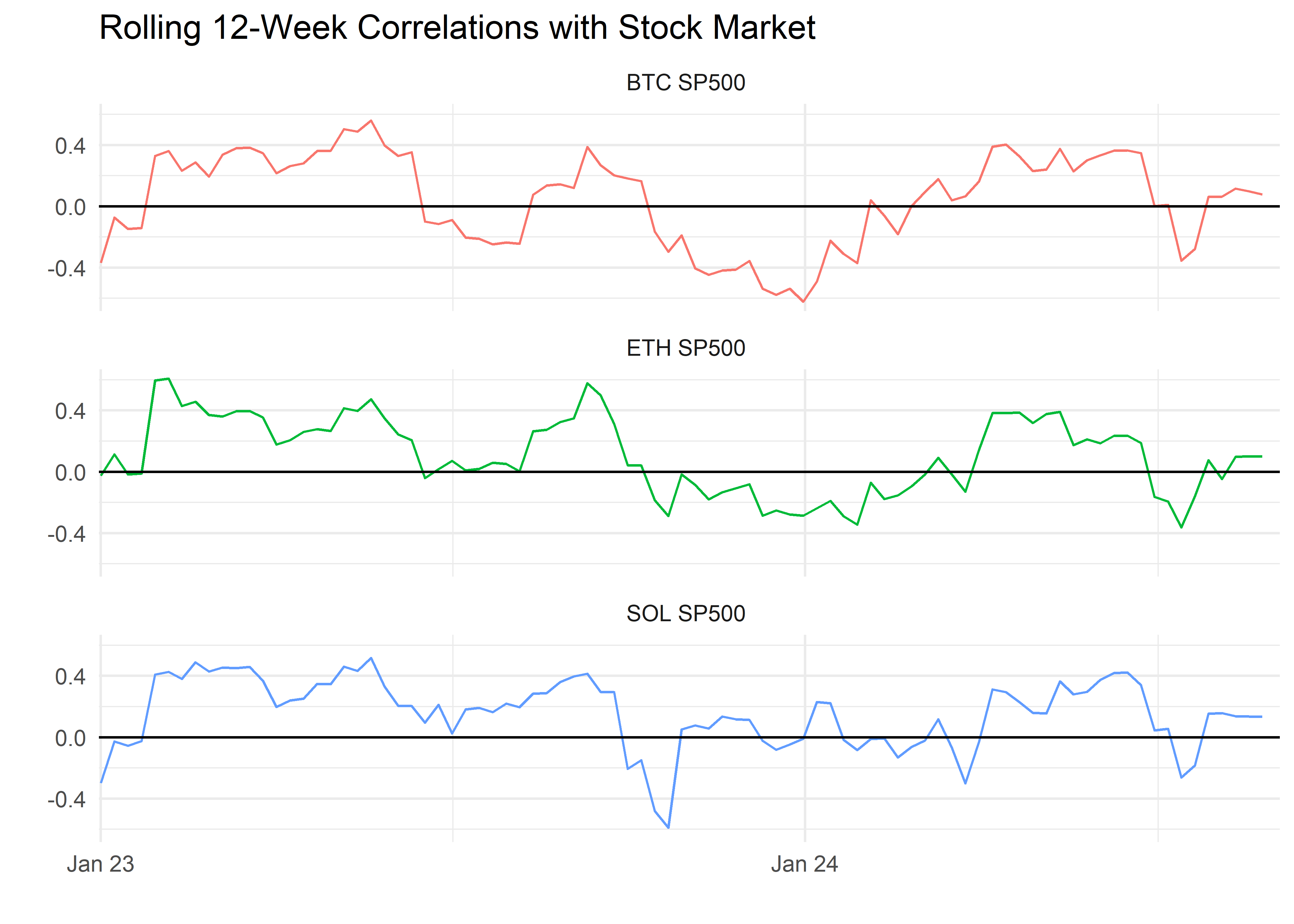 Before we begin building portfolios, let’s glance at rolling correlations with SP500. If the coins were to be consistently at a rolling correlation of 1, we wouldn’t get much in the way of diversification benefits from adding them a portfolio.