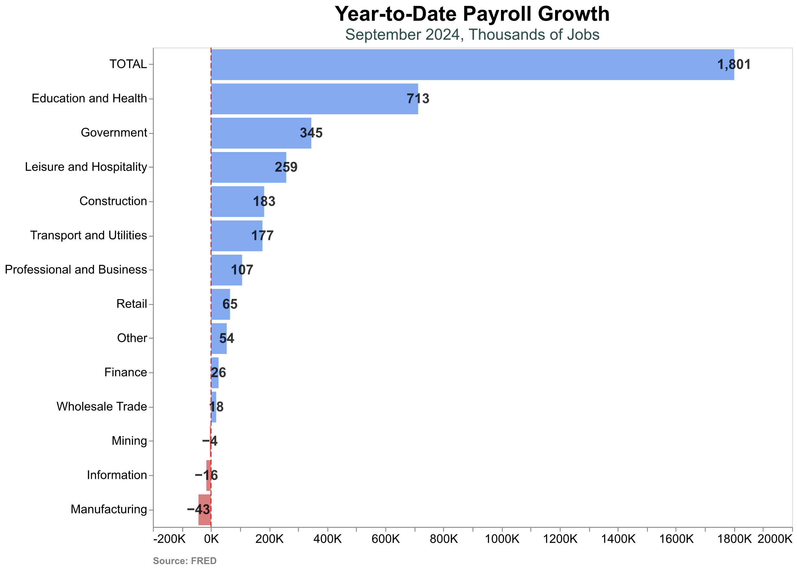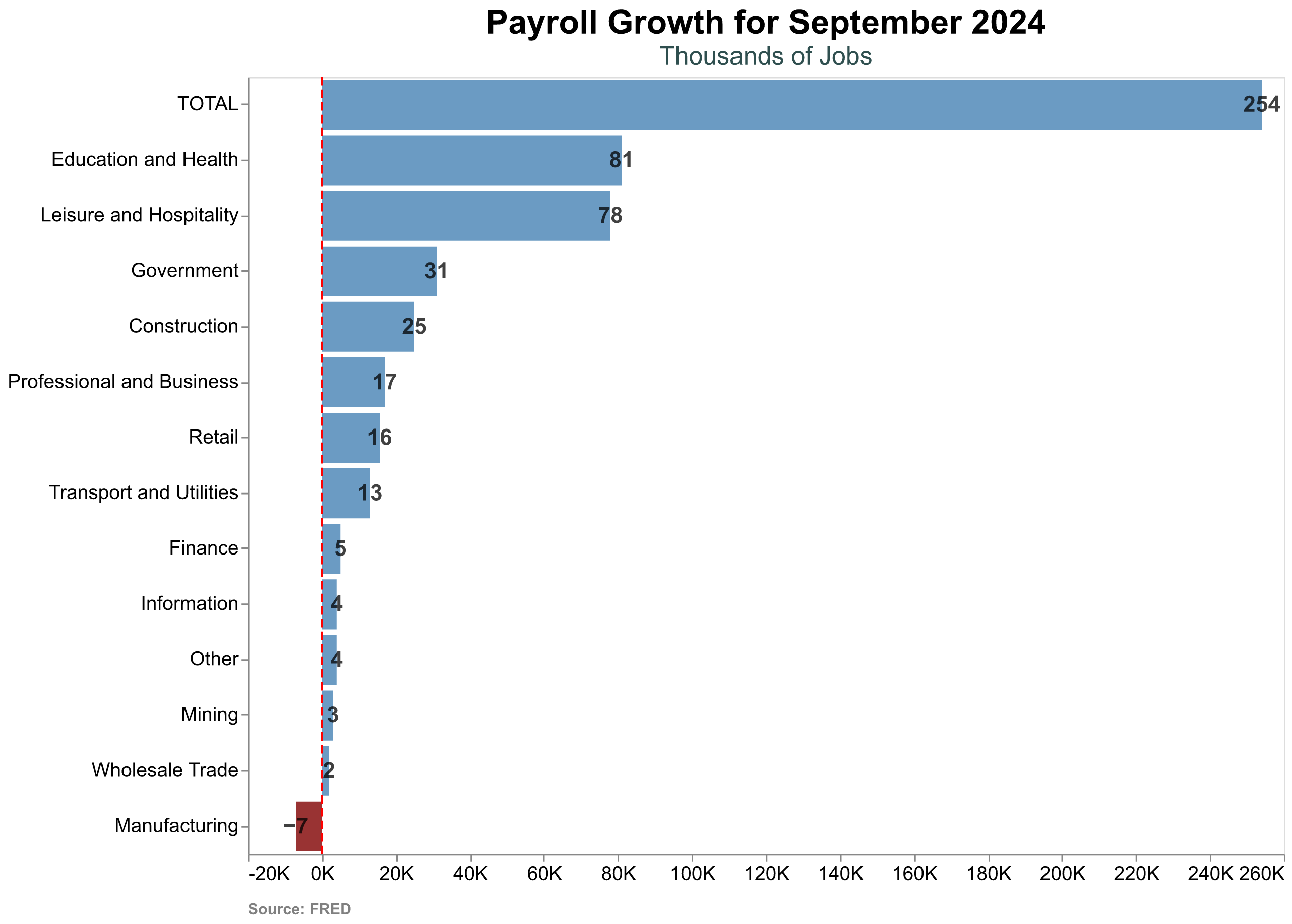 alt.layer(plot, labels, rule, footer)When we look at the sector breakdown of the jobs report, Education and Health and Leisure and Hospitality account for the bulk of the growth, while Manufacturing is the only sector that decreased. One more reminder that services power our economy, a fact we sometimes seems to forget when going crazy about industrial policy.